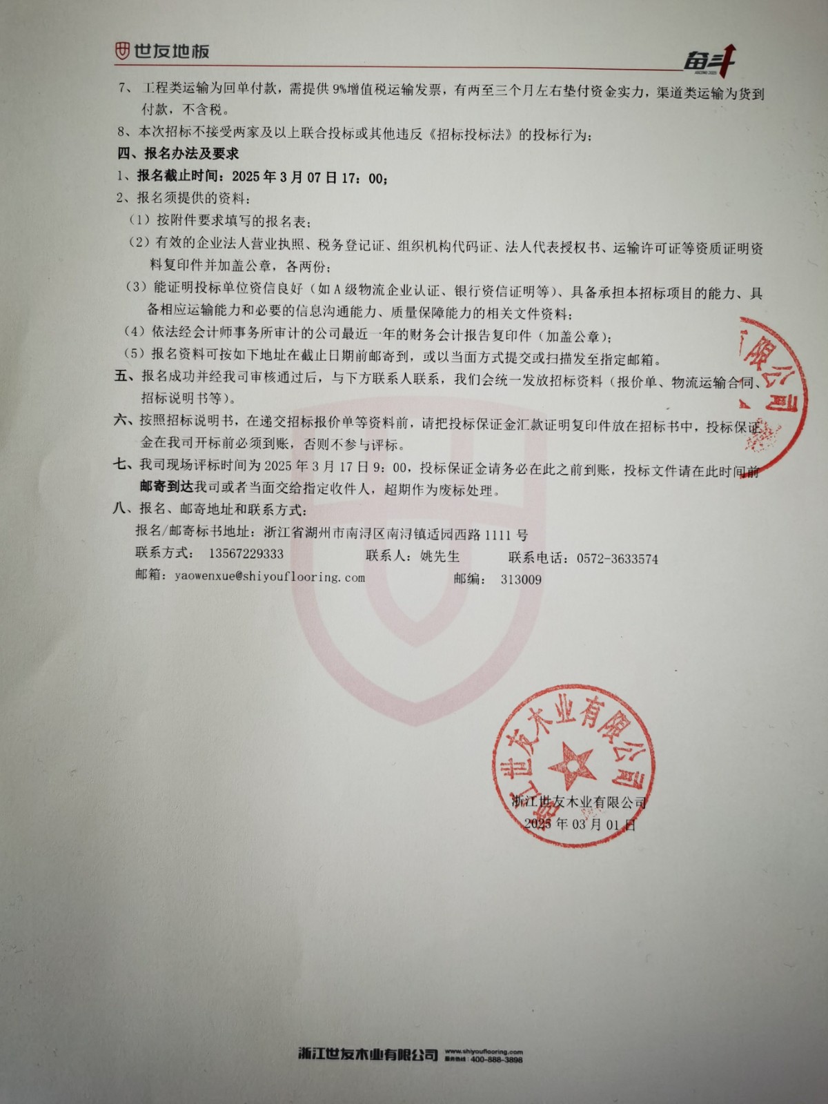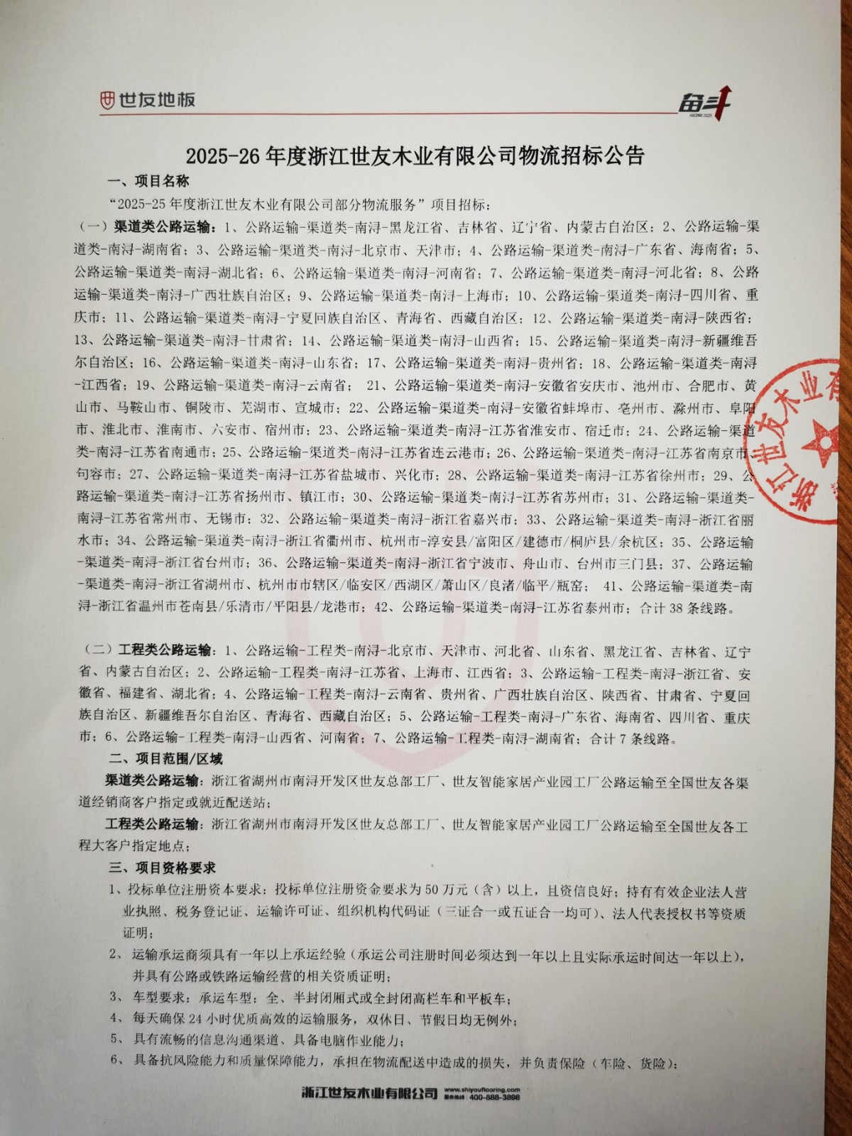 2025-26年度浙江世友木業有限公司物流招標公告